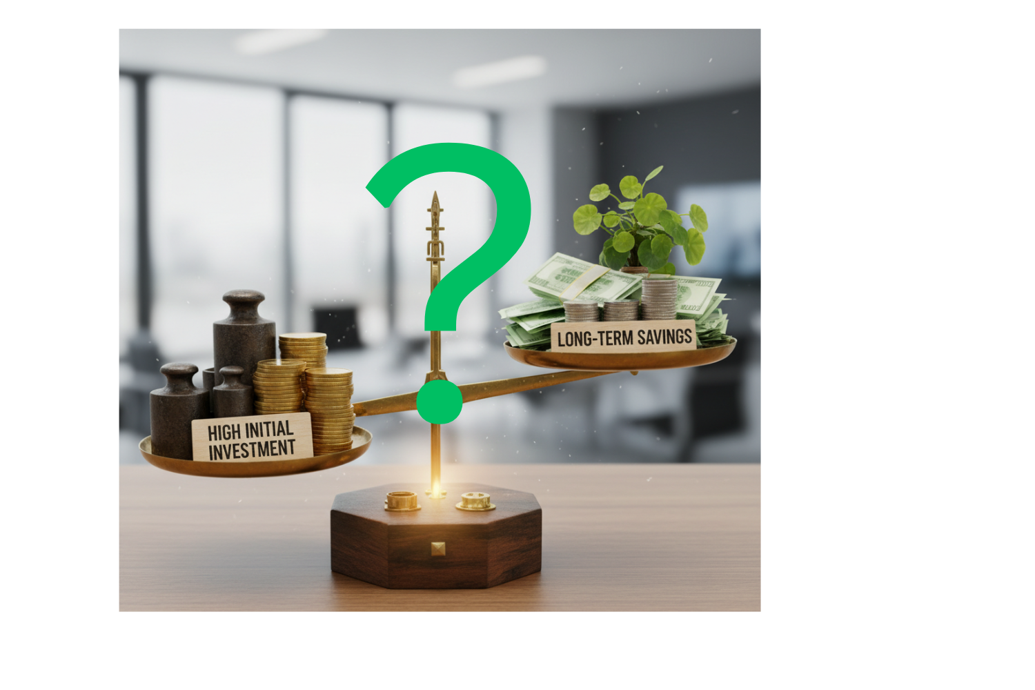 A balance scale showing high initial investment vs. long-term savings.